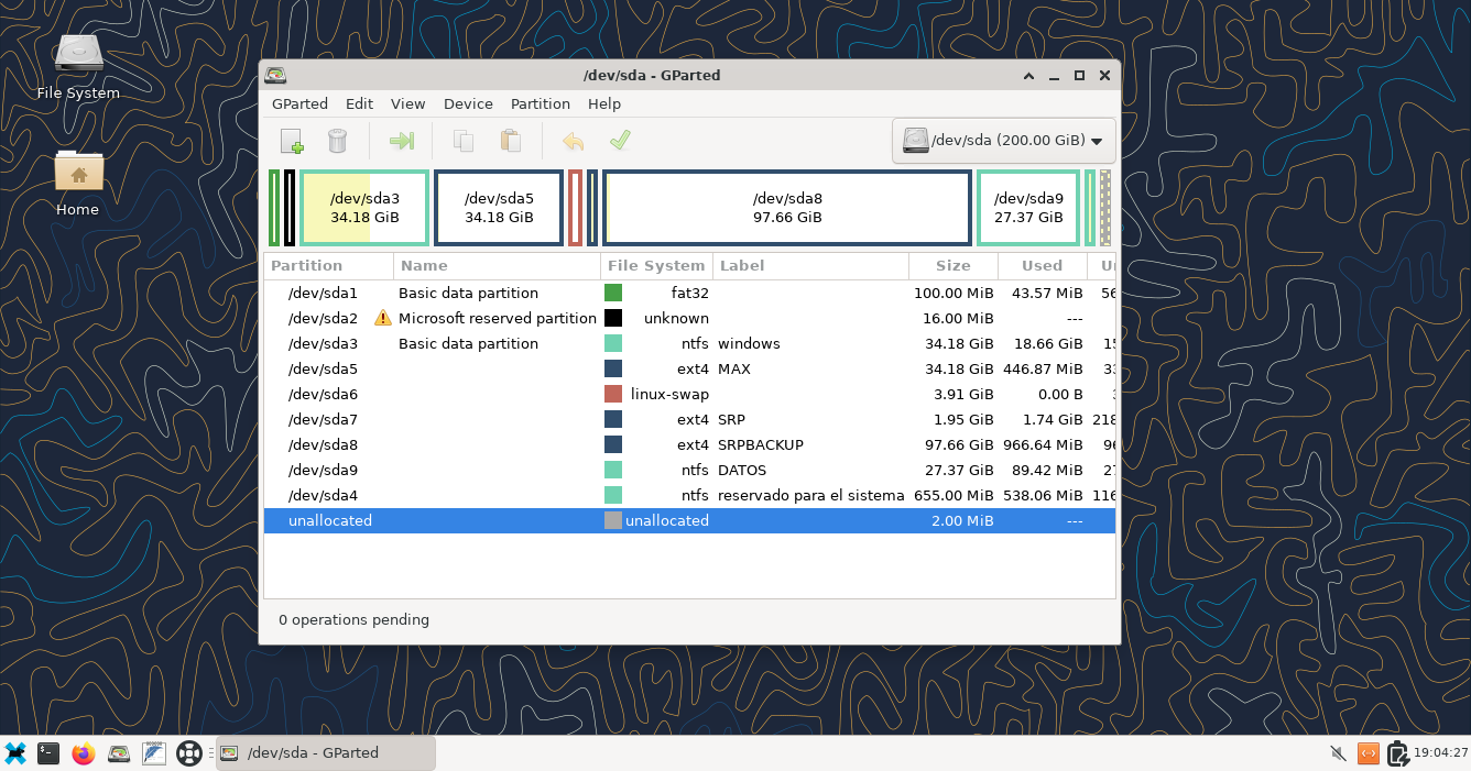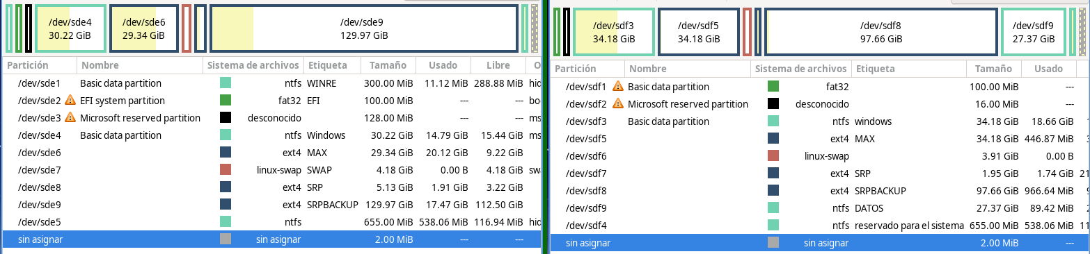 sda5 MAX con filesystem: ext4; sda6 (aprox. 4GB) filesystem: linux-swap ; sda7 SRP (aprox 2GB) filesystem ext4; sda8 SRPBACKUP filesystem: ext4; y aunque no se gestionará con el sistema SRP pues sería para datos de usuario, se ha creado una particion para DATOS en sda9 con filesystem ntfs que equivaldría al disco D: de windows.