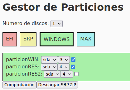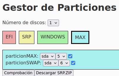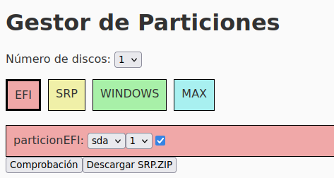 Por todo lo expresado anteriormente no se ha considerado práctico crear un archivo zip con el contenido de los archivos de configuración de menús y script fijo del estilo del srp.zip que se puede descargar de la página de Roberto, sino que se ha considerado más práctico crear una página web con un entorno gráfico que, de acuerdo a la configuración de particiones del disco de nuestro equipo, haga la selección de las opciones correspondiente en dicha página y una vez completada y comprobada la configuración, pulsando en descargar el archivo se obtenga el srp.zip ajustado a la configuración de particionse de nuestro disco/s.