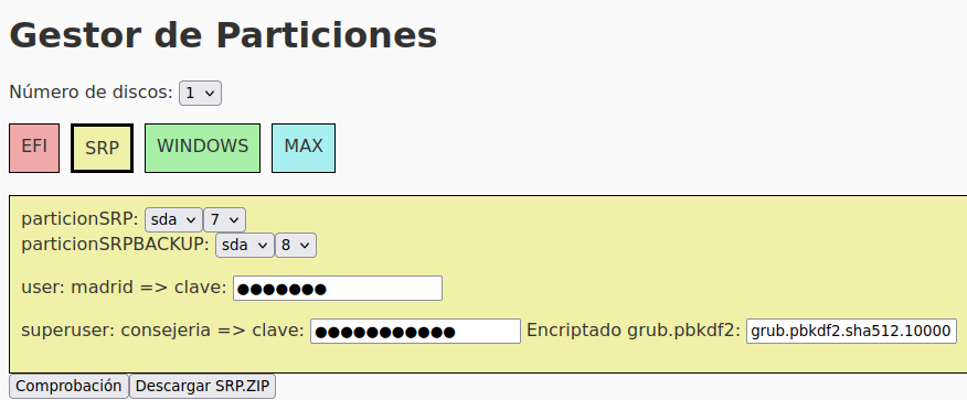 Para la pestaña SRP, dejariamos sda7 para SRP y sda8 para SRPBACKUP como quedo con gparted también se configurarían las contrseñas de los usuarios "madrid y consejería", si no se cambian quedarían las de por defcto "cmadrid y cconsejeria" respectivamente: