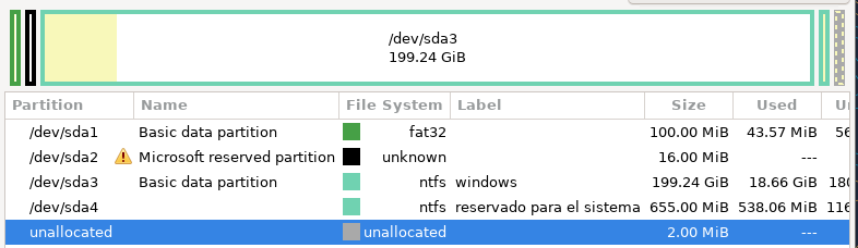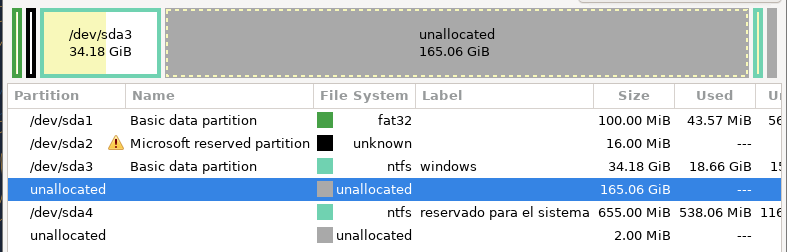 Vemos que windows tiene dos particiones que debamos considerar, las dos con file system: NTFS que son sda3 que es de gran tamaño y correspondería con el disco C: de windows y la pequeña "reservado para el sistema" sda4.