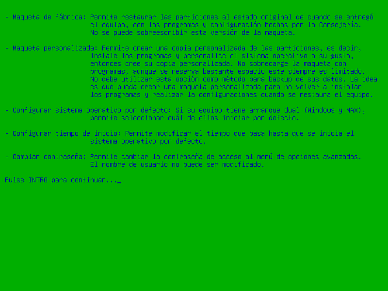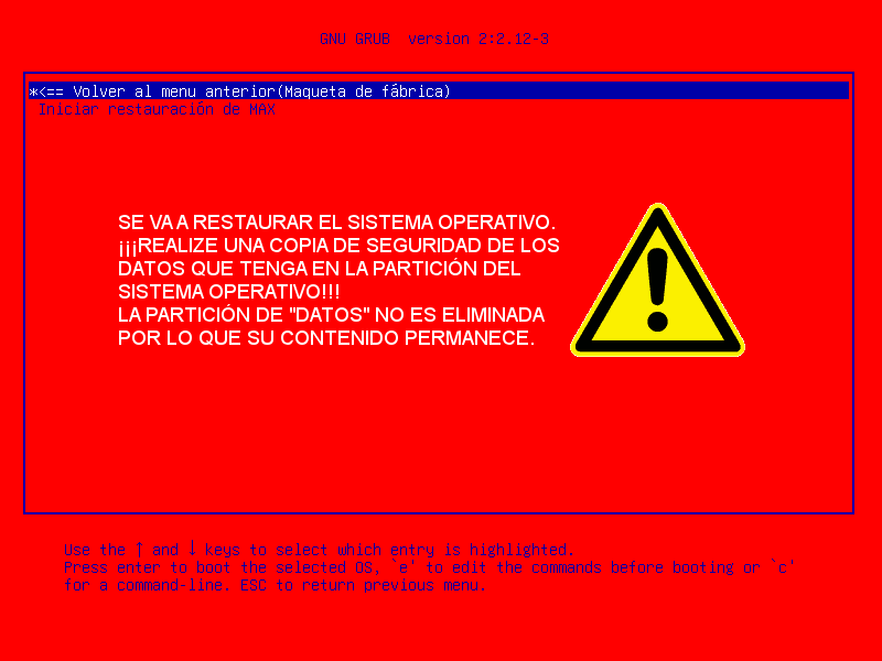 Desde este menú solo podemos restaurar la partición de Windows, la de MAX o ambas y la partición de arranque EFI. La maqueta de fábrica sólo tiene la opción de restaurar.