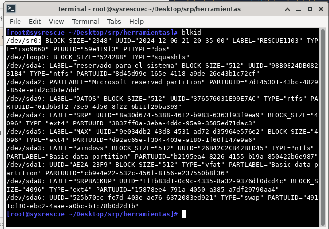 Comenzamos por la copia de los archivos de System Rescue CD: lo primero es que necesitamos es saber en qué disco y partición se ha asignado al DVD o usb para lo que ejecutaremos el comando: blkid , que nos listará todas las particiones de discos, CD, DVD o usb conectadas, sabremos cual corresponde al DVD o usb por que las que ya sabemos van des sda1 a sda9 que configuramos con gparted, el usb es probable que fuese sdb1, en nuestro caso es con DVD que aparece como sr0: