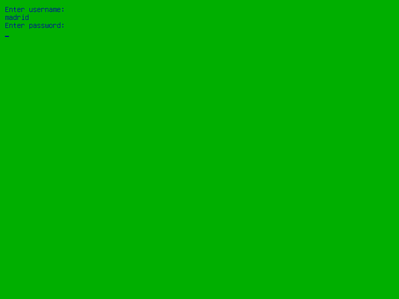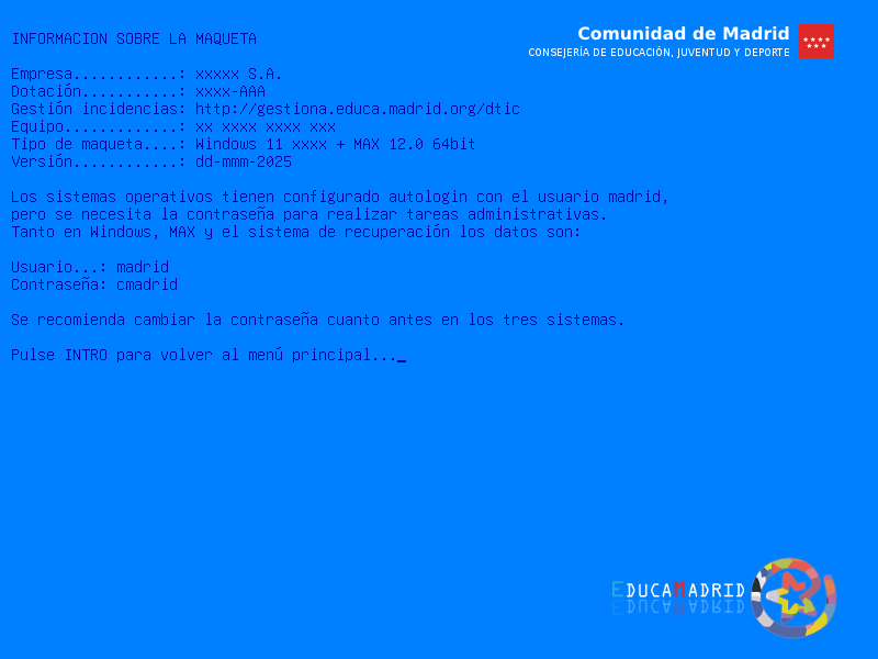 El acceso a este menú está bloqueado mediante usuario y contraseña. Los datos por defecto son para el usuario administrador normal "madrid" y contraseña "cmadrid" (como se dice en información conviene cambiar dicha contraseña), pero existe un superusuario con mayores permisos que por defecto se crearía con nombre de usuario "consejeria" y contraseña "cconsejeria", la contraseña en este superusuario se guarda encriptada. Se trata de que sólo el personal autorizado pueda realizar las labores de cambio de contraseña del usuario madrid, el SO de arranque por defecto, el tiempo de espera para arrancar el SO por defecto, restauración del equipo, creación de un backup del equipo o arrancar en la consola o entorno gráfico de SRP.