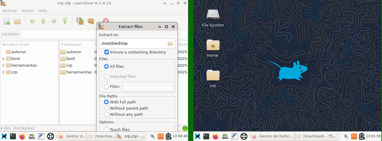 Desde Mozilla Firefox podemos acceder al fichero srp.zip que se habrá descargado en "/root/Downloads", hacemos dblclick en el archivo y se abrirá una ventana en en descompresor, seleccionamos en el icono para extraer (en la ventana o menú "Action/Estract") y en la ventana que se abre navegar en "Estract to:" se despliega otra ventana en que pulsamos el icono "Desktop" (/root/Desktop) y a continuacion el boton "open", "/root/Desktop" aparecerá en en "Estract to:" y al extraer aparcera la carpeta srp carpeta en el escritorio.