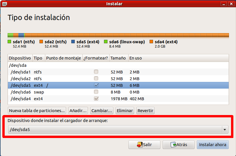 Tambien nos ofrece instalar su versión de Grub en sda, pero para que la configuración de SRP pueda funcionar correctamente no debemos instalarlo en dev/sda sino que debemos instalarlo en su misma partición: dev/sdaX (en la imagen dev/sda5).