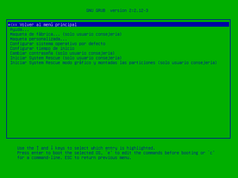 Esta dos opciones reservadas al superusuario "consejeria" (una con la consola de texto y la otra en modo gráfico con todas las particiones montadas en "/mnt" lo que nos facilitaría realizar las tareas que el "superusuario" se planteara al entrar.