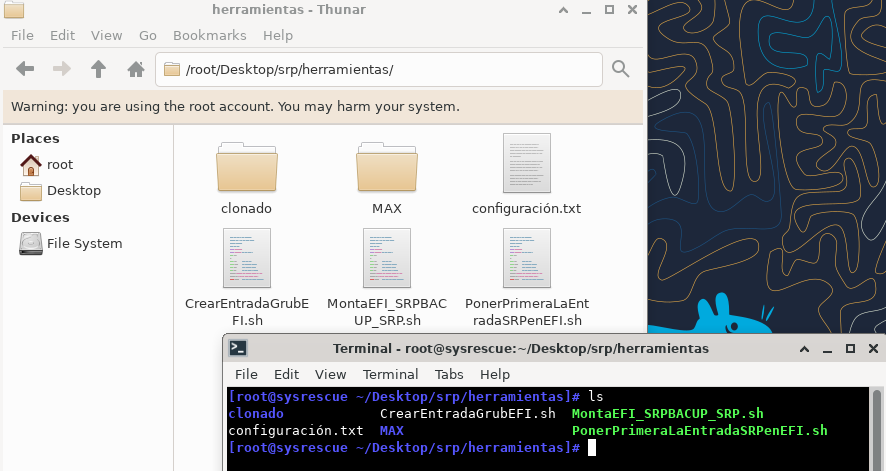De la misma forma copiamos a /mnt/SRPBACKUP las carpetas que hay dentro de la carpeta srp del escrtorio a saber: srp, boot, herramientas y autorun. (realmente solo sería extrictamente necesario copiar srp y boot pero hemos visto que contiene scripts que pueden se necesarios en otras ocasiones y autorun sería una copia de seguridad de la copia que hicimos en SRP, ya que al apagar todo lo que tenemos en escritorio o en mnt se desmonta y desaparece y solo quedaría permanente lo que hemos colocado en SRPBACKUP)(el contenido de boot se añadiría a lo que creó en su momento el script que crea la entrada SRP en EFI).