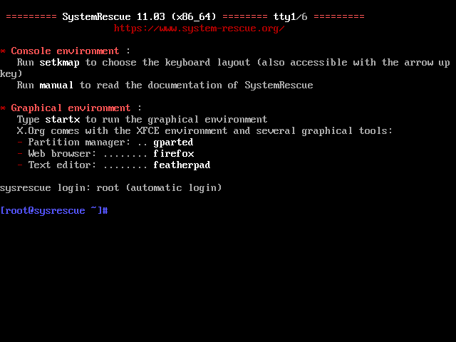 System Rescue es un sistema basado en linux y arranca en modo texto, cuando se completa el arranque nos muestra una consola con cierta información de interés y un prompt para que tecleemos las órdenes precisemos. con el aspecto que sigue: